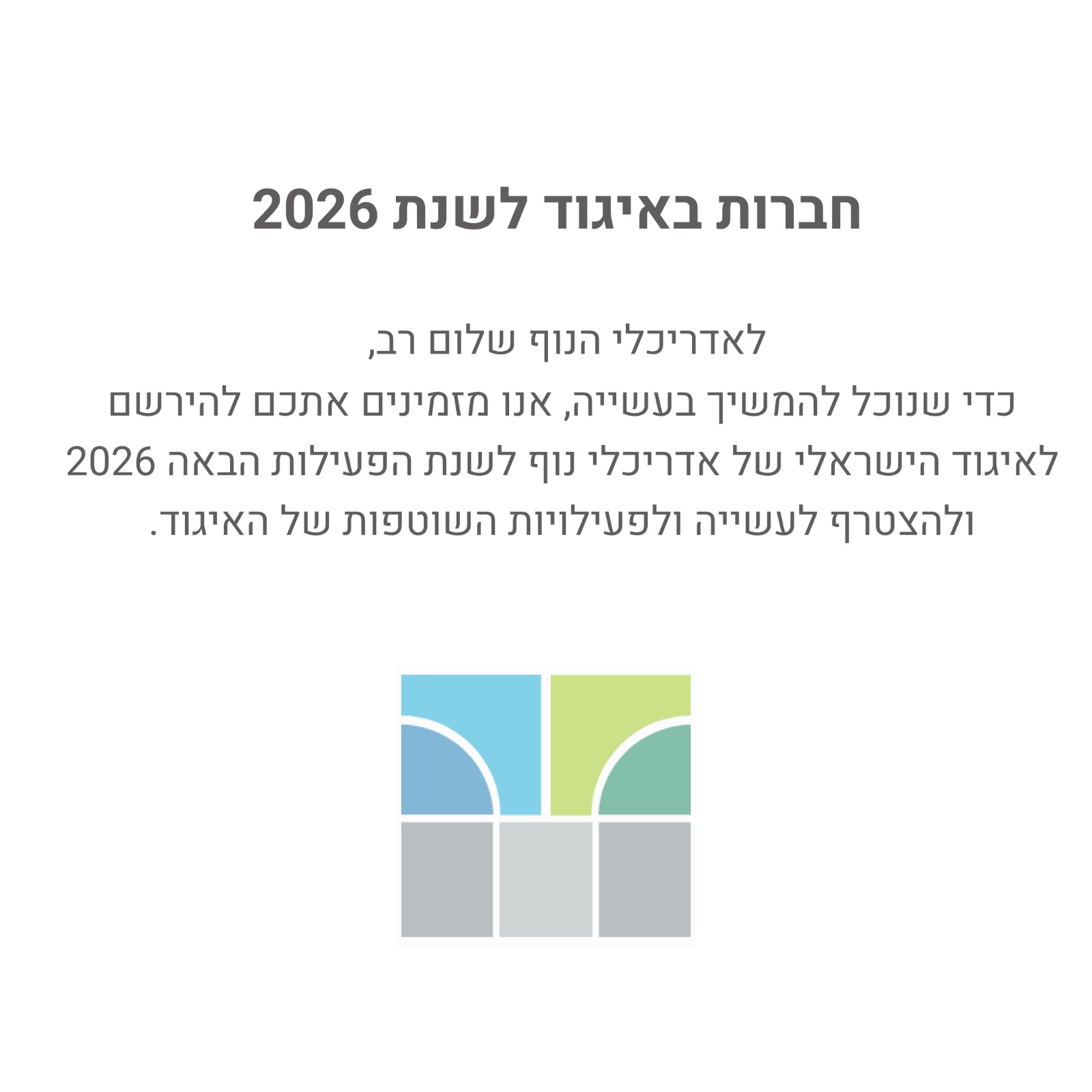 לאדריכלי הנוף שלום רב, כדי שנוכל להמשיך בעשייה, אנו מזמינים אתכם להירשם לאיגוד הישראלי של אדריכלי נוף לשנת הפעילות הבאה 2026 ולהצטרף לעשייה ולפעילויות השוטפות של האיגוד.